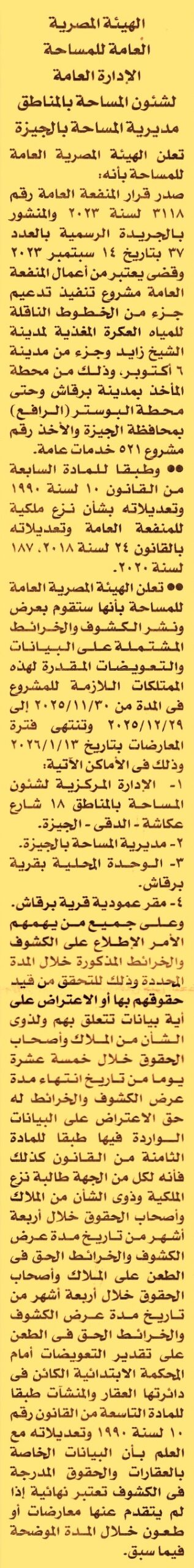 وقضى بتقرير صفة النفع العام لمشروع تنفيذ تدعيم جزء من الخطوط الناقلة للمياه العكرة المغذية لمدينة الشيخ زايد وجزء من مدينة 6 أكتوبر