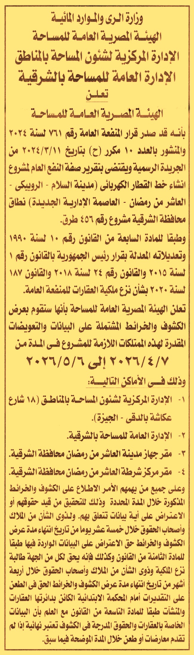 تعلن الهيئة المصرية العامة للمساحة بأنه صدر قرار المنفعة العامة رقم 761 لسنة 2024