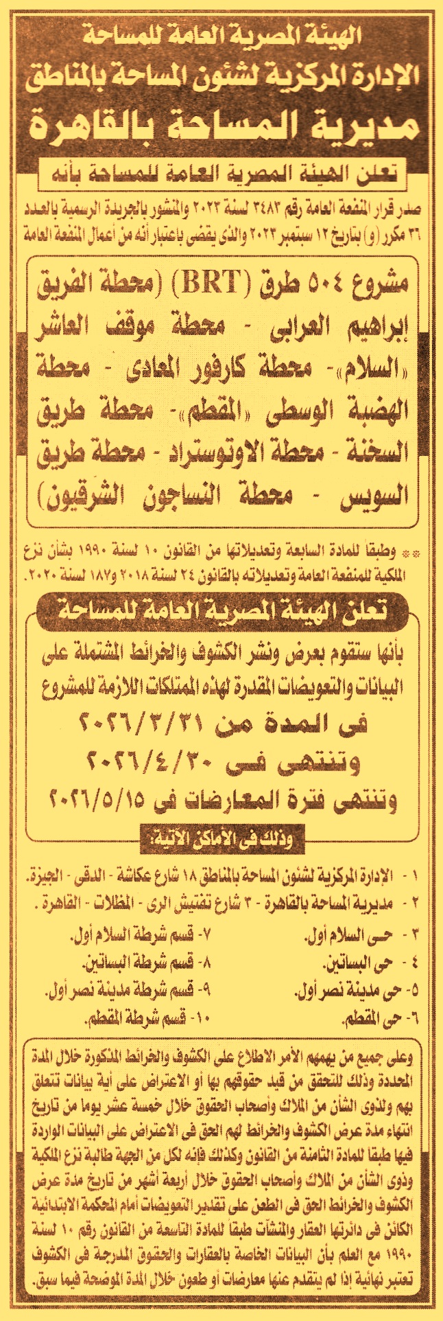 تعلن الهيئة المصرية العامة للمساحة بأنها ستقوم بعرض ونشر الكشوف والخرائط المشتملة على البيانات والتعويضات المقدرة لهذه الممتلكات اللازمة للمشروع