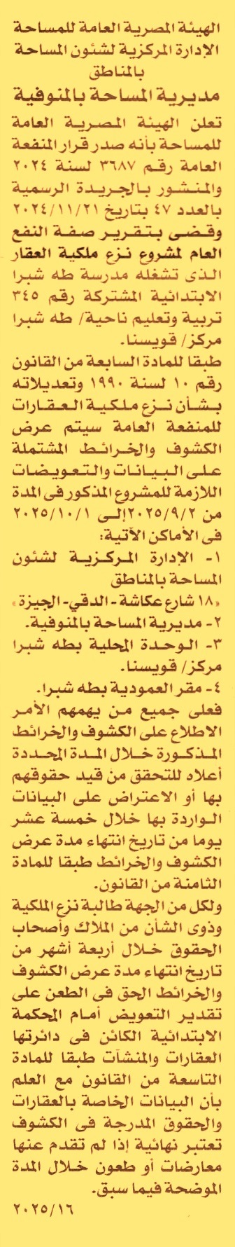 تعلن الهيئة المصرية العامة للمساحة بأنه صدر قرار المنفعة العامة رقم 3687 لسنة 2024