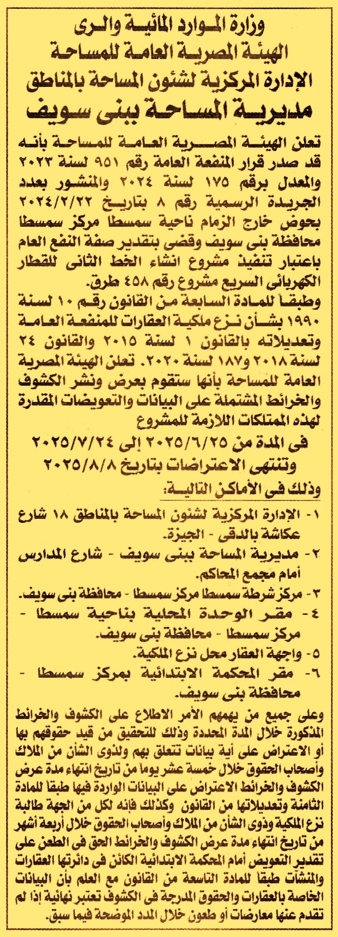 تعلن الهيئة المصرية العامة للمساحة بأنه صدر قرار المنفعة العامة رقم 951 لسنة 2023 والمعدل بالقرار رقم 175 لسنة 2024