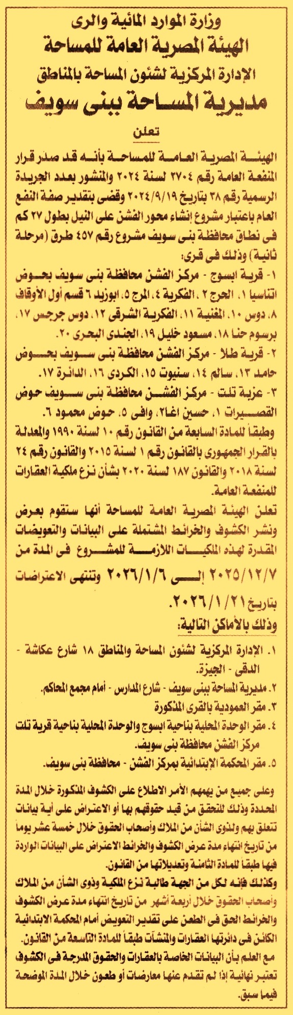 تعلن الهيئة المصرية العامة للمساحة بأنها ستقوم بعرض ونشر الكشوف والخرائط المشتملة على البيانات والتعويضات المقدرة لهذه الممتلكات اللازمة للمشروع