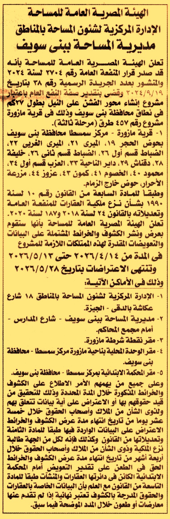 تعلن الهيئة المصرية العامة للمساحة بأنها ستقوم بعرض ونشر الكشوف والخرائط المشتملة على البيانات والتعويضات المقدرة لهذه الممتلكات اللازمة للمشروع