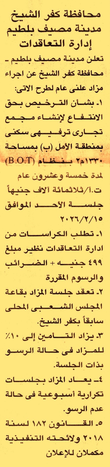 HOT Information مزايدة علنية عامة لعملية إنشاء مجمع تجاري ترفيهي سكني بمنطقة الأمل “ب” بمساحة 1330م2 بنظام حق الإنتفاع لمدة 25 سنة (تعاد الجلسة أسبوعيا حتى إتمام الرسو) عن جريدة الجمهورية Post navigation مركز د/ عبد الأحد جمال الدين للتنمية الشبابية بشرشابة مركز شباب أبو شلبي بالإسماعيلية