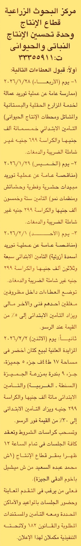 HOT Information ممارسة عامة لعملية توريد عمالة لخدمة المزارع الحقلية والبستانية والمشاتل ومحطات الإنتاج الحيواني عن جريدة الجمهورية Post navigation نادي فاقوس الرياضي الهيئة العامة للنظافة والتجميل