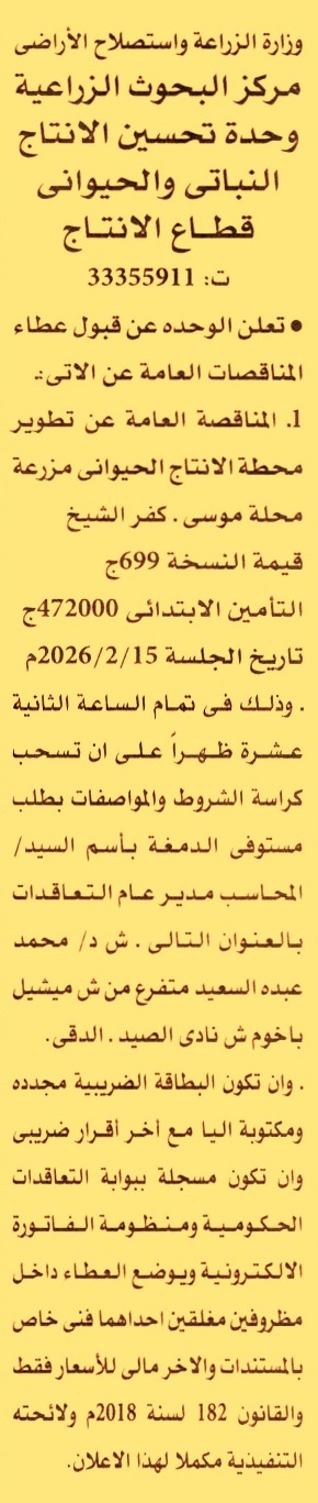 HOT Information مناقصة عامة لعملية تطوير محطة الإنتاج الحيواني مزرعة محلة موسى – كفر الشيخ عن جريدة الأهرام Post navigation الجمعية التعاونية العامة للإصلاح الزراعي جامعة قنا
