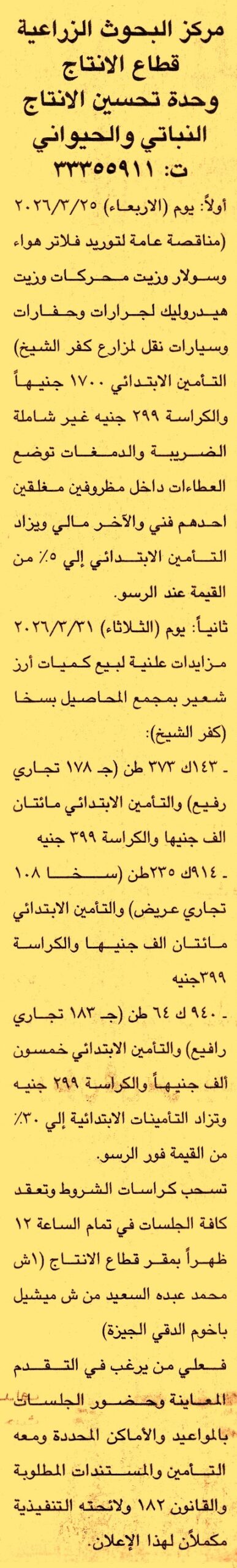 HOT information مناقصة عامة لعملية توريد فلاتر هواء وسولار وزيت محركات وزيت هيدروليك لجرارات وحفارات وسيارات نقل لمزارع كفر الشيخ عن جريدة الجمهورية Post navigation محافظة أسيوط جامعة عين شمس