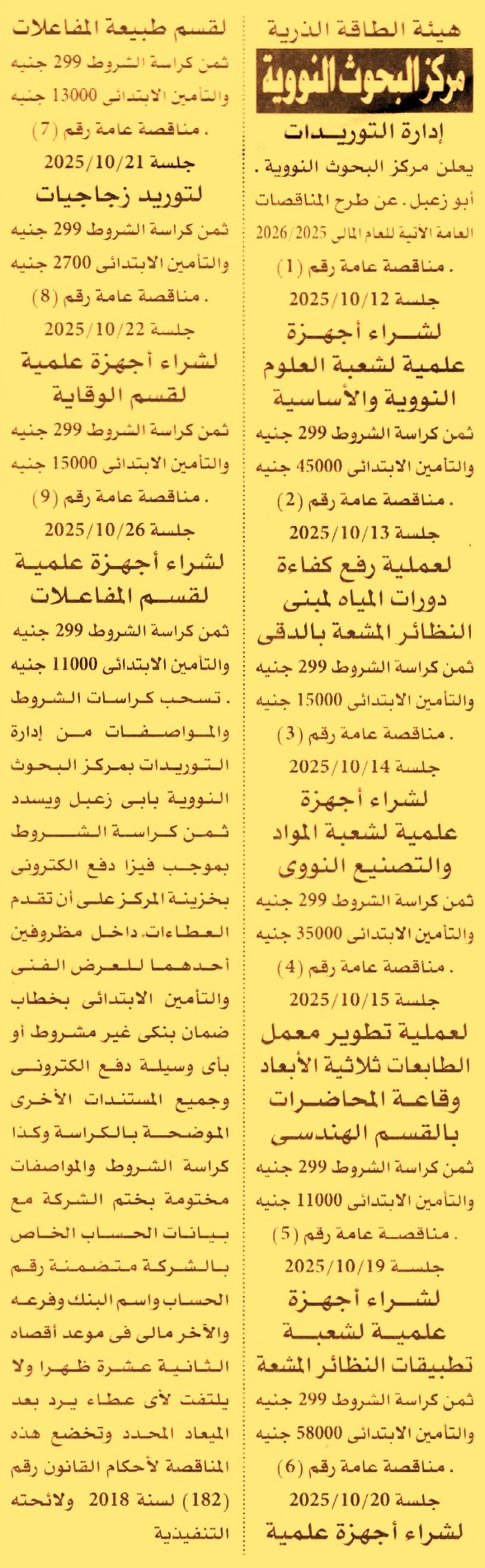 HOT information مناقصة عامة رقم 1/2025/2026 لعملية توريد أجهزة علمية لشعبة العلوم النووية والأساسية عن جريدة الأهرام Post navigation نادي الصيد المصري المعمل المركزي لتحليل متبقيات المبيدات