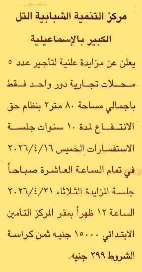 HOT Information مزايدة علنية لعملية تأجير عدد 5 محلات تجارية دور 1 فقط بإجمالي مساحة 80م2 بنظام حق الإنتفاع لمدة 10 سنوات (جلسة الاستفسارات يوم 16/4/2026 الساعة 10 ص) عن جريدة الجمهورية Post navigation مركز شباب بن هلال جامعة المنيا