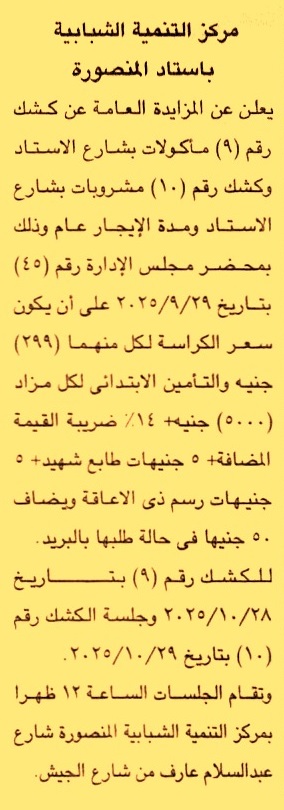 تأجير كشك رقم 9 مأكولات بشارع الاستاد