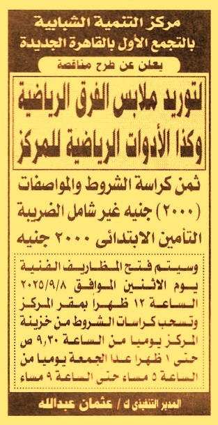 HOT Information مناقصة عامة لعملية توريد ملابس الفرق الرياضية وكذا الأدوات الرياضية للمركز (تباع الكراسة يوميا من الساعة 9:30 ص حتى 1 ظ عدا الجمعة من الساعة 5 م حتى 9 م) عن جريدة الأخبار Post navigation شركة مياه الشرب بالقاهرة الكبرى جامعة طنطا