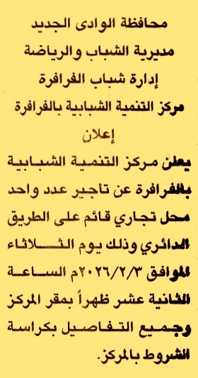 HOT Information مزايدة عامة لعملية تأجير عدد 1 محل تجاري قائم على الطريق الدائري عن جريدة الجمهورية Post navigation الشركة المصرية للصيانة وخدمات السكك الحديدية مركز التنمية الشبابية لمدينة بسيون