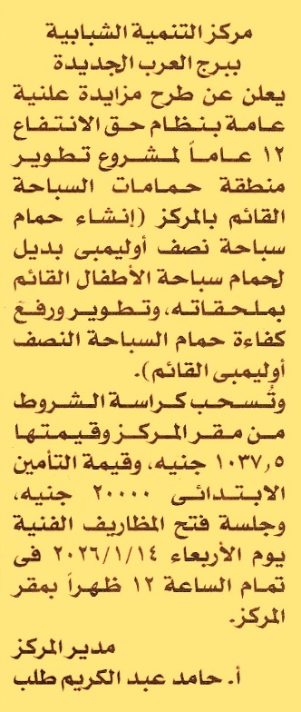 “إنشاء حمام سباحة نصف أوليمبي بديل لحمام سباحة الأطفال القائب بملحقاته