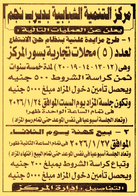 HOT information مزايدة علنية لعملية تأجير عدد 5 محلات تجارية بسور المركز بنظام حق الإنتفاع لمدة 5 سنوات (تعاد الجلسة أسبوعيا حتى إتمام الرسو) عن جريدة الجمهورية Post navigation شركة التعاون للبترول نقابة المعلمين بالشرقية