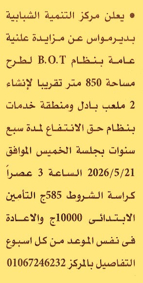 HOT information إعادة مزايدة علنية لعملية طرح مساحة 850م تقريبا لإنشاء 2 ملعب بادل ومنطقة خدمات بنظام حق الإنتفاع لمدة 7 سنوات (تعاد الجلسة أسبوعيا حتى إتمام الرسو) عن جريدة الأهرام Post navigation محافظة البحر الأحمر صندوق دعم مشروعات الجمعيات والمؤسسات الأهلية