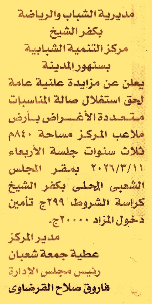 HOT Information مزايدة علنية عامة لعملية حق استغلال صالة المناسبات متعددة الأغراض بأرض ملاعب المركز بمساحة 840م لمدة 3 سنوات عن جريدة الأخبار Post navigation الشركة المصرية للتمويل العقاري رئاسة مركز ومدينة بسيون