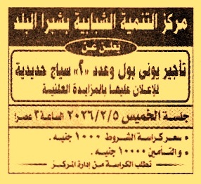 HOT Information مزايدة علنية لعملية تأجير يوني بول وعدد 2 سياج حديدية للإعلان عليها عن جريدة الجمهورية Post navigation الجهاز المركزي للمحاسبات الشركة المصرية للثروات التعدينية
