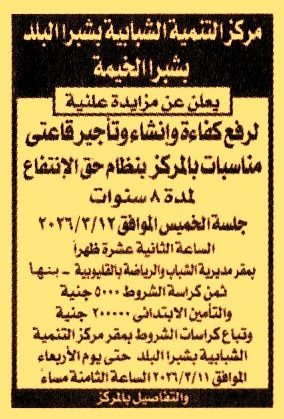 HOT Information مزايدة علنية لعملية رفع كفاءة وإنشاء وتأجير قاعتي مناسبات بالمركز بنظام حق الإنتفاع لمدة 8 سنوات (أخر موعد لشراء الكراسة يوم 11/3/2026 الساعة 8 م) عن جريدة الجمهورية Post navigation الوحدة المحلية لمركز ومدينة قلين جامعة عين شمس