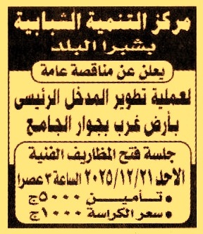 HOT Information مناقصة عامة لعملية تطوير المدخل الرئيسي بأرض غرب بجوار الجامع عن جريدة الجمهورية Post navigation محافظة جنوب سيناء وزارة الشباب والرياضة