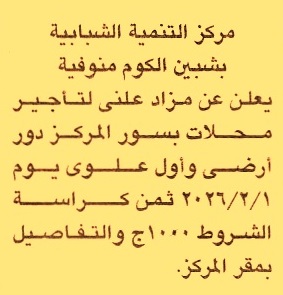 HOT Information مزايدة علنية لعملية تأجير محلات بسور المركز دور أرضي وأول علوي عن جريدة الجمهورية Post navigation مركز شباب منشأة سلطان بالمنوفية مدينة البعوث الإسلامية