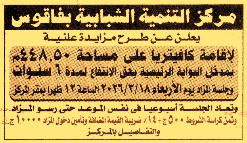 HOT Information مزايدة علنية لعملية إقامة كافتيريا على مساحة 448.50م بمدخل البوابة الرئيسية بنظام حق الإنتفاع لمدة 6 سنوات عن جريدة الجمهورية Post navigation نادي صيد وادي النطرون نادي تليفونات بني سويف