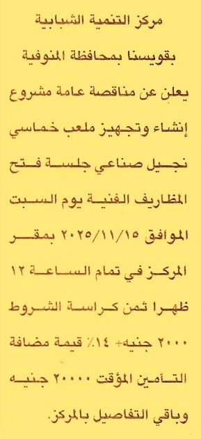 HOT information مناقصة عامة لعملية إنشاء وتجهيز ملعب خماسي نجيل صناعي عن جريدة الجمهورية Post navigation مستشفى طب الأزهر الجامعي نادي الرياضات البحرية بالغردقة