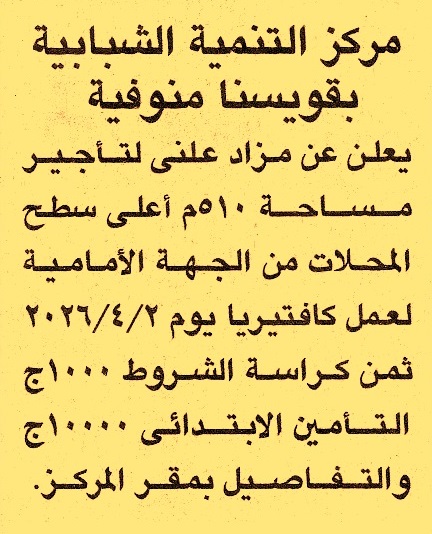 HOT information مزايدة علنية لعملية تأجير مساحة 510م2 أعلى سطح المحلات من الجهة الأمامية لعمل كافتيريا عن جريدة الجمهورية Post navigation الهيئة المصرية العامة لمشروعات الصرف الوحدة المحلية لمركز ومدينة قلين