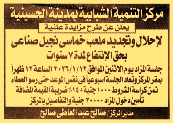 HOT Information مزايدة علنية لعملية إحلال وتجديد ملعب خماسي نجيل صناعي بنظام حق الإنتفاع لمدة 7 سنوات (تعاد الجلسة أسبوعيا حتى إتمام الرسو) عن جريدة الجمهورية Post navigation مركز شباب زاوية بمم بالمنوفية الإدارة العامة لري السلام غرب