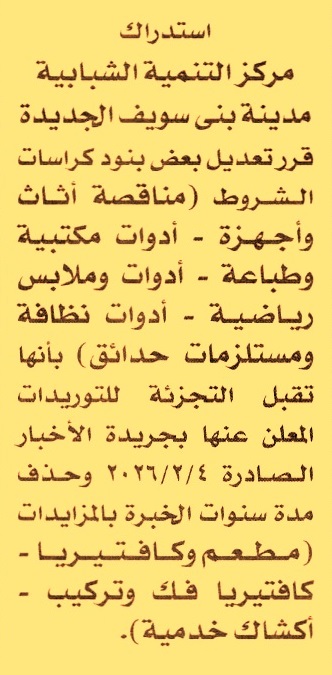 بأنها تقبل التجزئة للتوريدات المعلن عنها بجريدة الأخبار يوم 4/2/2026