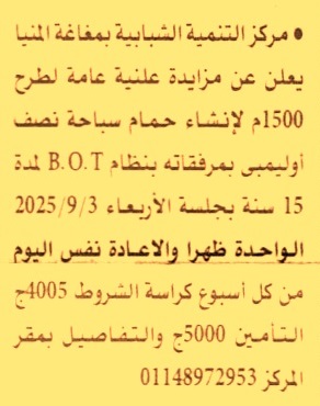 HOT Information مزايدة علنية عامة لعملية طرح 1500م لإنشاء حمام سباحة نصف أوليمبي بمرفقاته بنظام حق الإنتفاع لمدة 15 سنة (تعاد الجلسة أسبوعيا حتى إتمام الرسو) عن جريدة الأهرام Post navigation مركز شباب الإبراهيمية القبلية بدمياط جامعة دمنهور