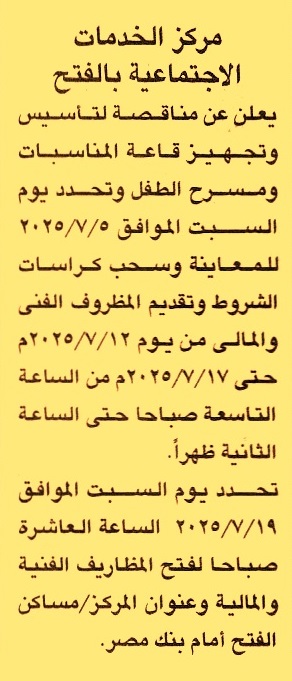 HOT Information مناقصة عامة لعملية تأسيس وتجهيز قاعة المناسبات ومسرح الطفل (جلسة المعاينة يوم 5/7/2025 وتقدم العطاءات في الفترة من 12/7/2025 وحتى 17/7/2025 من الساعة 9 ص حتى 2 ظ) عن جريدة الجمهورية Post navigation الوحدة المحلية لمركز ومدينة الزرقا محافظة سوهاج