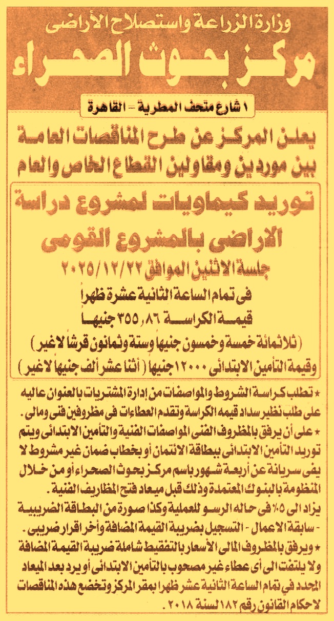 HOT Information مناقصة عامة لعملية توريد كيماويات لمشروع دراسة الأراضي بالمشروع القومي (مدة سريان خطاب الضمان 4 أشهر ويرفق مع المستندات سابقة أعمال وأخر إقرار ضريبي) عن جريدة الجمهورية Post navigation الهيئة العامة لميناء الإسكندرية شركة قها للأغذية المحفوظة