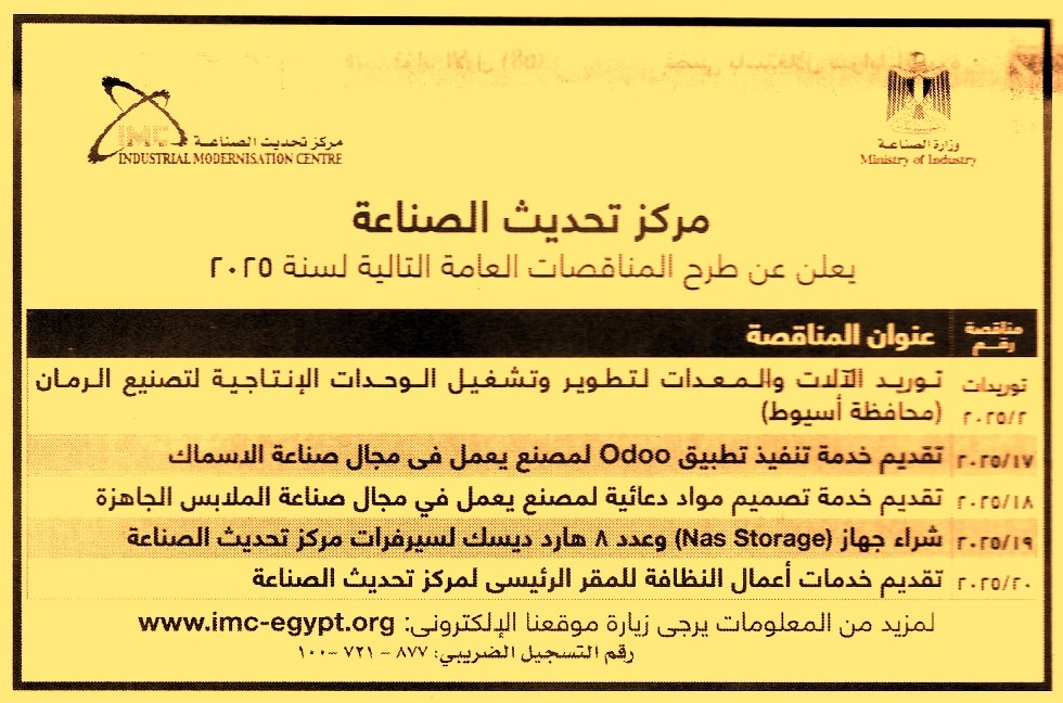 HOT Information مناقصة عامة رقم 2/2025 لعملية توريد الألات والمعدات لتطوير وتشغيل الوحدات الإنتاجية لتصنيع الرمان “محافظة أسيوط” عن جريدة الأهرام Post navigation الشركة المصرية للمطارات مركز ومدينة شرم الشيخ