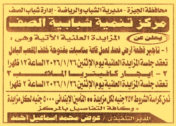 HOT Information مزايدة علنية عامة لعملية تأجير قطعة أرض فضاء لعمل قاعة مناسبات مفتوحة خلف الملعب البادل عن جريدة الجمهورية Post navigation مركز شباب طحلة ببنها محافظة البحيرة