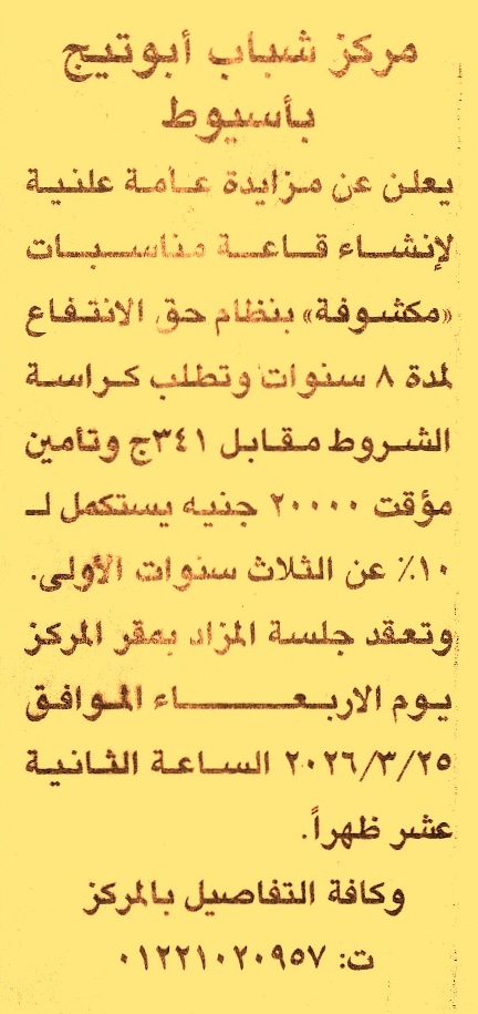 HOT Information مزايدة علنية عامة لعملية إنشاء قاعة مناسبات “مكشوفة” بنظام حق الانتفاع لمدة 8 سنوات عن جريدة الجمهورية Post navigation وزارة الاتصالات وتكنولوجيا المعلومات نادي الغردقة الرياضي