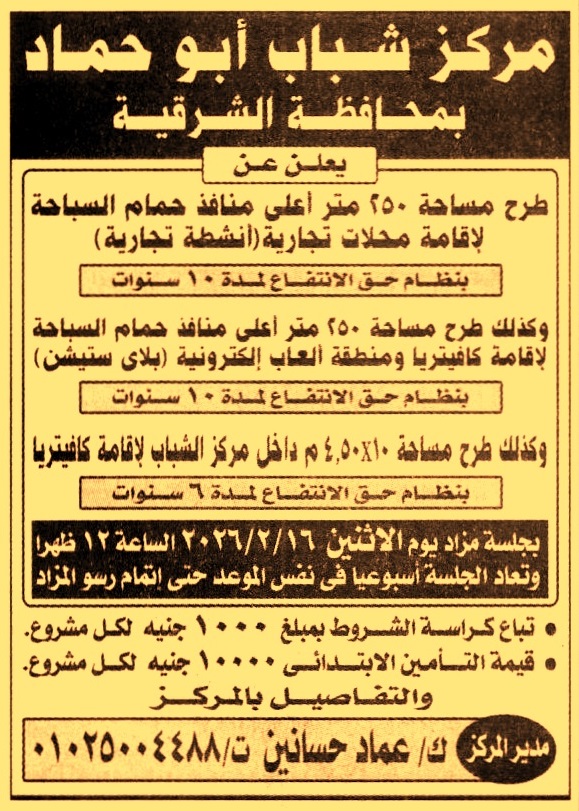 (3) مساحة 10×4.50م داخل مركز الشباب لإقامة كافتيريا بنظام حق الإنتفاع لمدة 6 سنوات