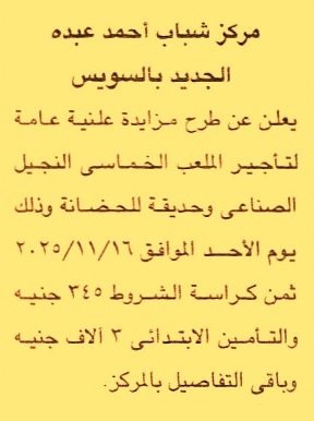 HOT Information مزايدة علنية عامة لعملية تأجير حديقة للحضانة عن جريدة الجمهورية Post navigation جامعة قنا مركز شباب الجلاتمة بالجيزة