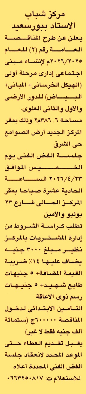 HOT Information مناقصة عامة رقم 2/2025/2026 لعملية إنشاء مبنى اجتماعي إداري مرحلة أولى “الهيكل الخرساني والمباني والبياض” للدور الأرضي والأول والثاني العلوي بمساحة 386.6م2 وذلم بمقر المركز الجديد أرض الصوامع – حي الشرق عن جريدة الجمهورية Post navigation مؤسسة معاً للتنمية والبيئة شركة البتروكيماويات المصرية