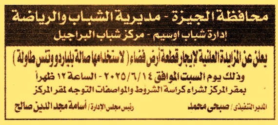 HOT Information مزايدة علنية عامة لعملية تأجير قطعة أرض فضاء لاستخدامها صالة بلياردو وتنس طاولة عن جريدة الجمهورية Post navigation جمعية الشبان المسلمين بالزقازيق محافظة الأقصر