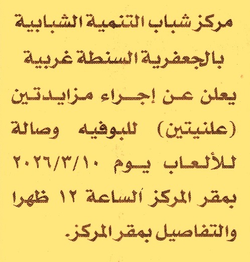 HOT information مزايدة علنية لعملية تأجير بوفيه عن جريدة الأخبار Post navigation شركة أل عزت للخبرة والتثمين محكمة كفر الشيخ