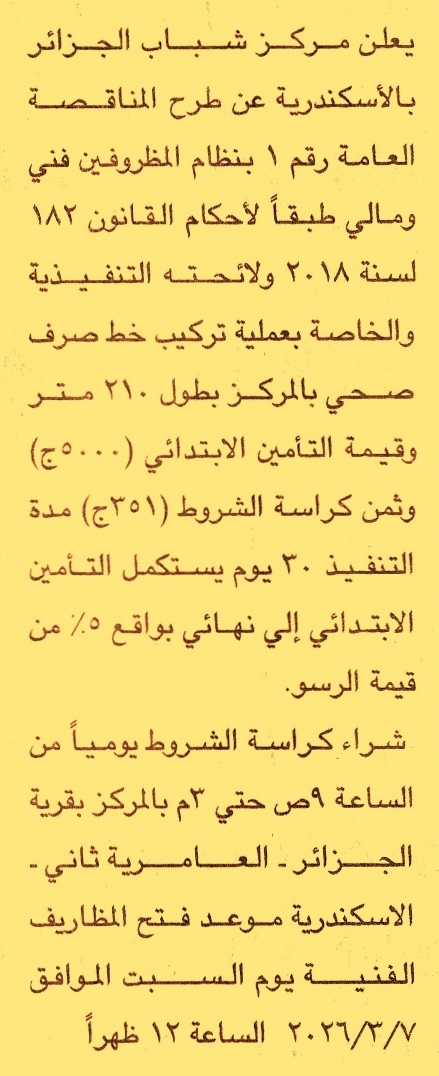 HOT Information مناقصة عامة رقم 1 لعملية تركيب خط صرف صحي بالمركز بطول 210م مدة التنفيذ 30 يوم عن جريدة الجمهورية Post navigation وزارة التعليم العالي نادي العاملين بشركة الإسكندرية للبترول