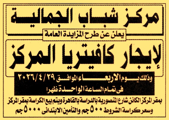 HOT Information مزايدة عامة لعملية تأجير كافتيريا المركز عن جريدة الجمهورية Post navigation مركز التنمية الشبابية بقويسنا مستشفيات جامعة طنطا
