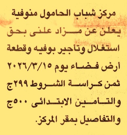 HOT Information مزايدة علنية لعملية حق استغلال وتأجير بوفيه وقطعة أرض فضاء عن جريدة الجمهورية Post navigation محافظة قنا مركز شباب ميت هاشم بسمنود