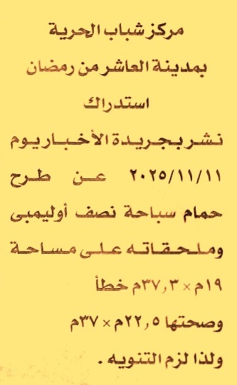 HOT Information مركز شباب الحرية بالعاشر من رمضان نشر بالإعلان الخاص بالمزايدة العلنية لعملية إقامة حمام سباحة نصف أوليمبي وملحقاته وكافتيريا على مساحة 19م×37.3م خطأ وصحتها 22.5م×37م ولذا لزم التنويه عن جريدة الأخبار Post navigation مركز بحوث الصحراء شركة مصر للبترول