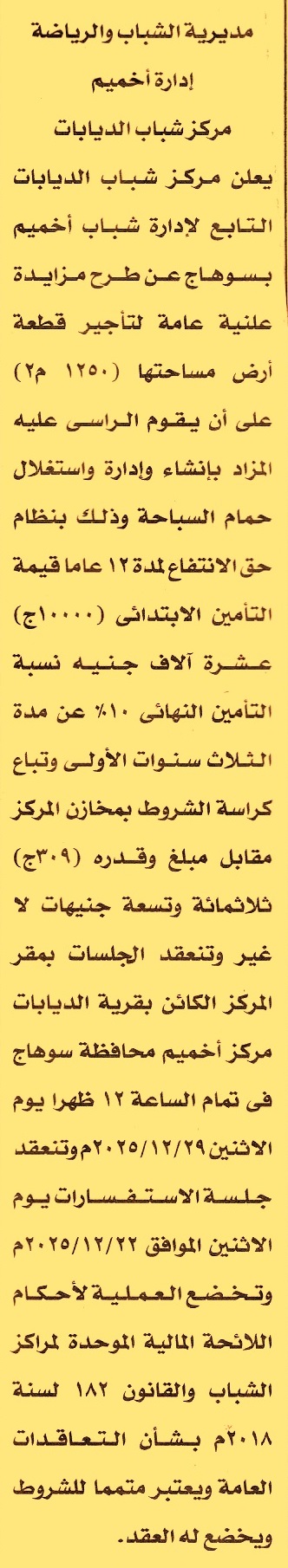 HOT Information مزايدة علنية عامة لعملية تأجير قطعة أرض بمساحة 1250م2 لإنشاء وإدارة واستغلال حمام السباحة بنظام حق الإنتفاع لمدة 12 سنة (جلسة الاستفسارات يوم 22/12/2025) عن جريدة الأخبار Post navigation شركة البدر لإدارة الأصول والتمويل شركة صان الحجر الزراعية