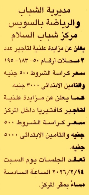 HOT Information مزايدة علنية عامة لعملية تأجير 3 محلات عن جريدة الجمهورية Post navigation الشركة القابضة لمصر للطيران الإدارة العامة لري الجيزة