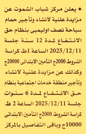 HOT Information مزايدة علنية لعملية إنشاء وتأجير حمام سباحة نصف أوليمبي بنظام حق الإنتفاع لمدة 12 سنة عن جريدة الأهرام Post navigation الشركة الوطنية لخدمات الملاحة الجوية الجهاز المركزي للتنظيم والإدارة