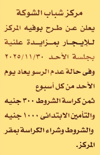 HOT Information مزايدة علنية لعملية تأجير بوفيه المركز (تعاد الجلسة أسبوعيا حتى إتمام الرسو) عن جريدة الأخبار Post navigation شركة مصر العامرية للغزل والنسيج مركز شباب كفر كردي بالقليوبية