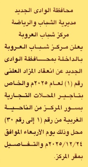 HOT Information مزايدة علنية رقم 1/2025 لعملية تأجير محلات تجارية بسور المركز من الناحية الغربية من رقم 1 إلى رقم 30 عن جريدة الجمهورية Post navigation جامعة المنصورة نادي تجديف بورسعيد