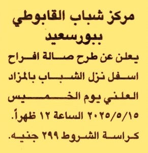 HOT Information مزايدة علنية لعملية تأجير صالة أفراح أسفل نزل الشباب عن جريدة الجمهورية Post navigation محافظة الإسماعيلية إدارة شباب كرداسة